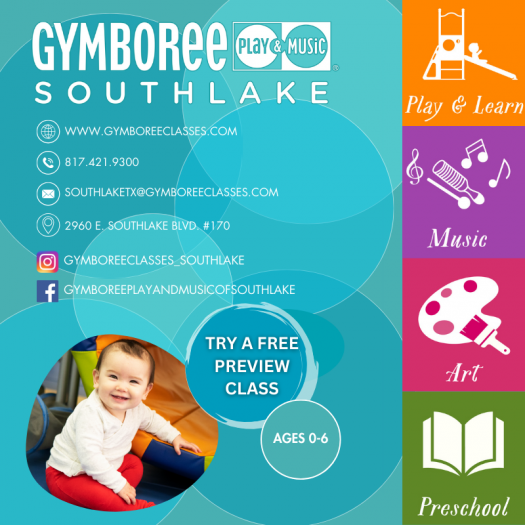 At Gymboree Play & Music of Southlake, dedicated teachers lead you and your little ones through Play & Learn, Music, or Art Classes. School Readiness Classes help children transition to learning apart from caregivers, and private parties give families exclusive use of our facilities, while themed parties can become traditions. Exclusive Times can be reserved for playdates, parenting groups, or Covid-bubbles. During Open Gyms, families may explore our play equipment at their leisure to get out those wiggles. Our quality toys, musical instruments, and Gymbo the Clown plush let children continue the fun at home. Schedule your free preview class (Play & Learn, Music, Art) today!